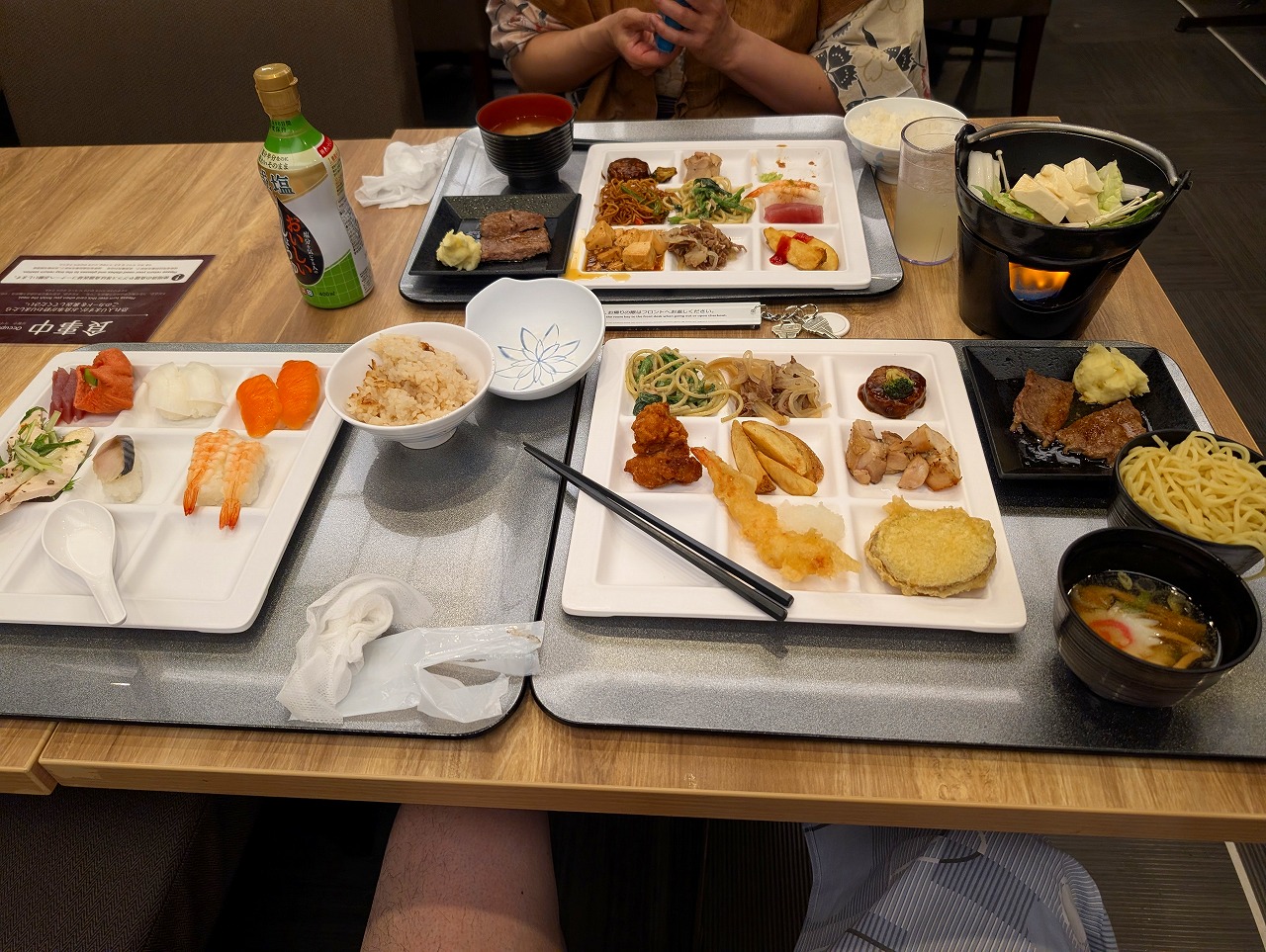 お出迎え下さいました。大江戸温泉ホテルグループなので、夕食・朝食バイキング。部屋からは日本海...あいにくの曇天。。。夕日見えず。